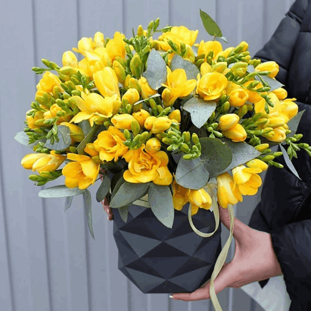 A cheerful mix of gerbera daisies, yellow freesia, and lavender to brighten any room. This bouquet is designed to evoke the peaceful joy of a new morning.