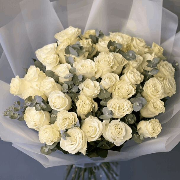 An immaculate arrangement of white roses, lilies, and eucalyptus, symbolizing purity and new beginnings. Its timeless beauty is ideal for weddings and solemn occasions.