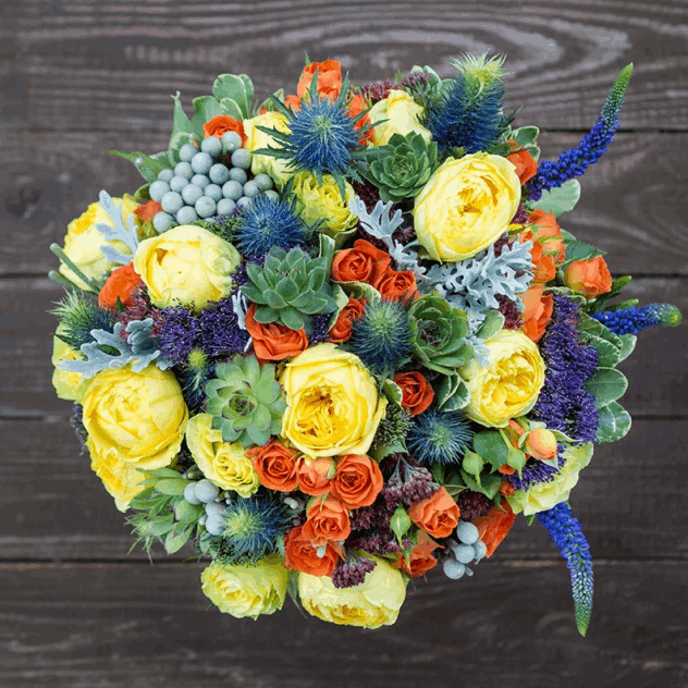 A lush and textural mix of seasonal greens, succulents, and spray roses. This modern design offers a unique, long-lasting floral experience.